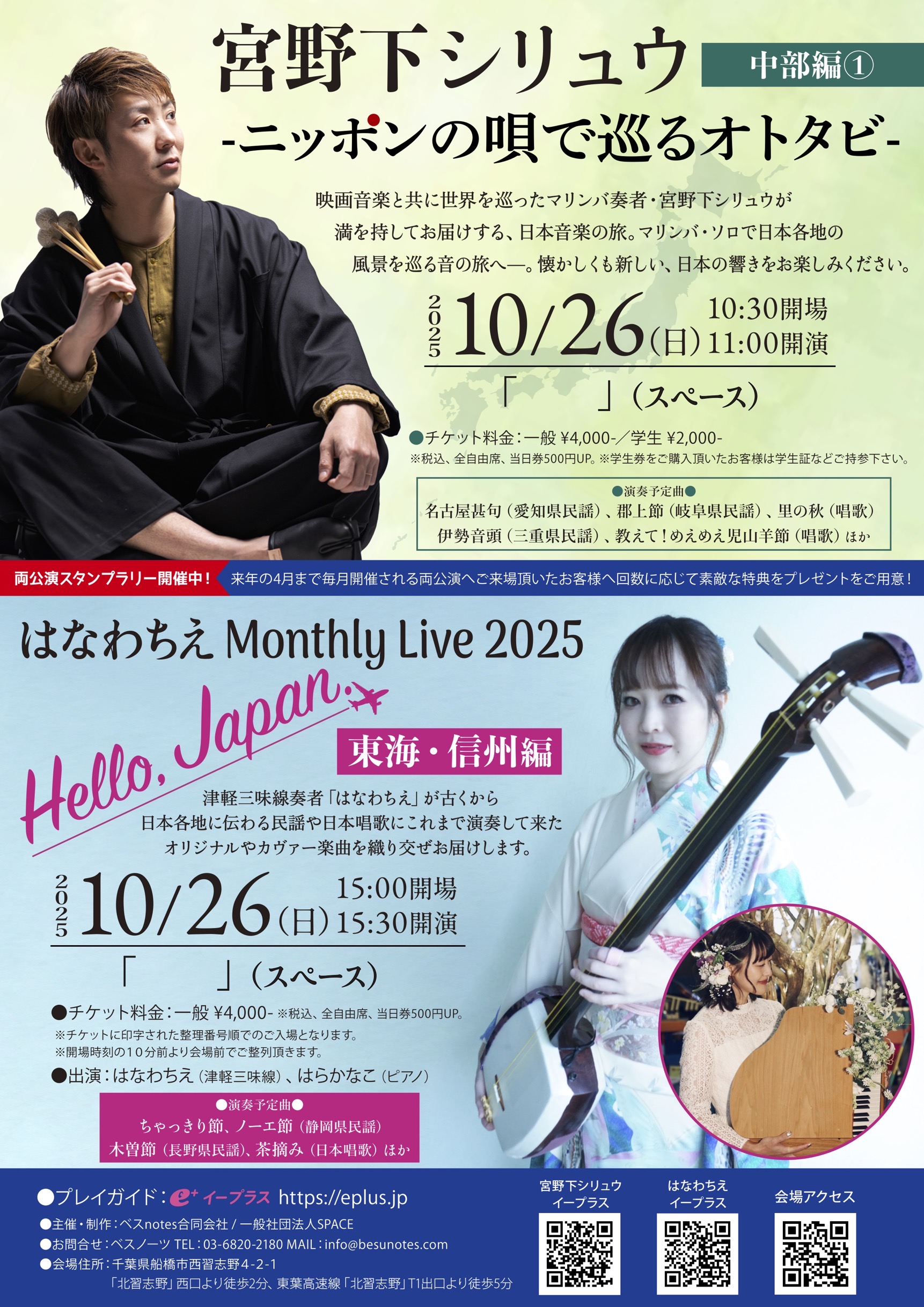 マリンバ奏者宮野下シリュウ、津軽三味線奏者のはなわちえの1日2番組マンスリーライブ
